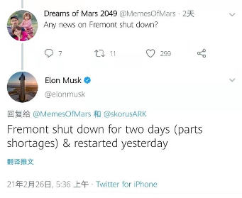 近日,特斯拉CEO马斯克在推特上回复粉丝提问时称,“费利蒙工厂确实关闭了两天(因零部件短缺),于昨日已重新启用。”这一消息引起外界讨论,纷纷猜测短缺的零部件或许是当下全球产量告急的车用芯片。出于对特斯拉未来一段时间产能下降的担忧,公司股价当日大跌8.06%。