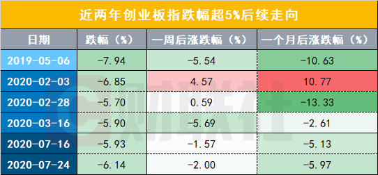 梳理近两年来创业板指大跌超5%后一周、一个月的创业板指行情,发现多数呈下跌态势。