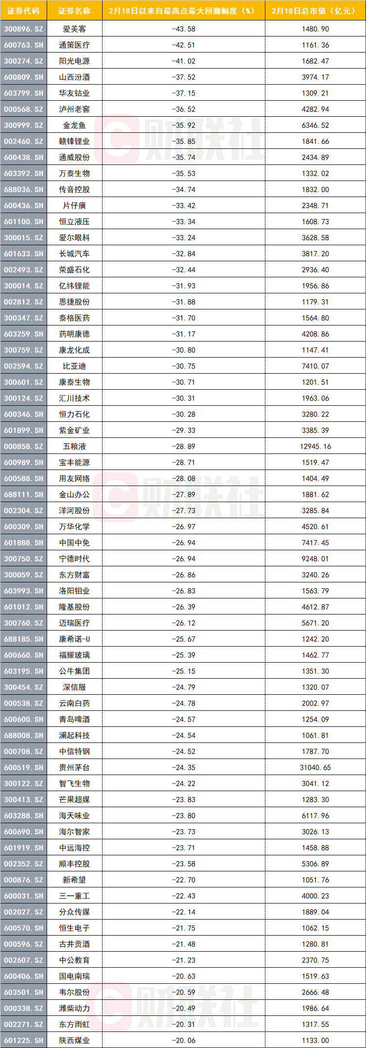 值得注意的是,从技术面上来看,指数和个股自高点回撤幅度超过20%一般都被认为是进入了技术性熊市,财联社通过统计发现,今年年初(2月18日)总市值超过1000亿元的白马股,截至3月5日收盘,有64股自节后最高点调整以来跌幅超过20%,如果按照目前的盘面来看的话,进入技术性熊市的抱团股数量也会进一步增多。