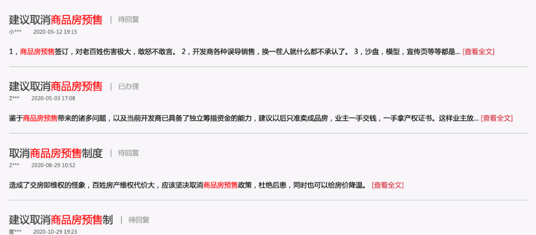 在人民网“领导留言板”上搜索“取消商品房预售”字样,会得到数十条相关结果。而其中大部分的事由,都与“烂尾房”“开发商跑路”有关。