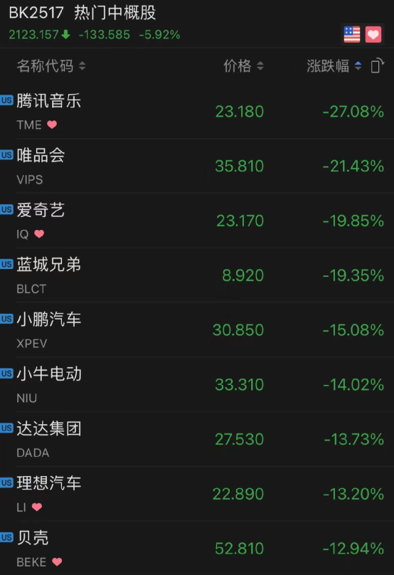周三,热门中概股普跌。其中,腾讯音乐跌27%,唯品会跌21%,爱奇艺跌近20%。