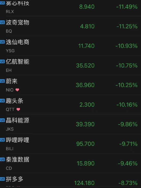 雾芯科技跌11.5%,哔哩哔哩跌近10%,拼多多跌超8%,趣头条跌超10%。
