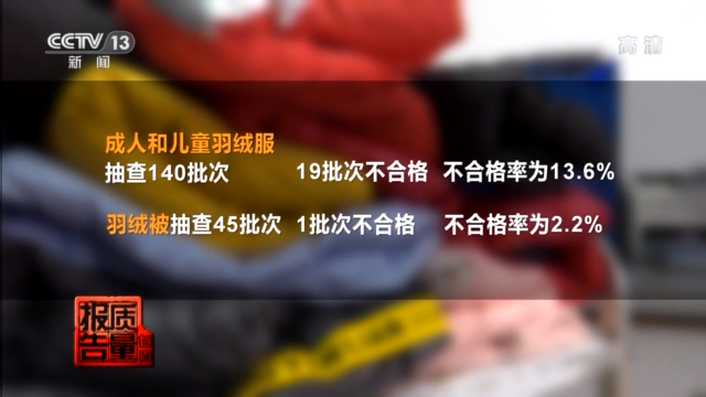 江苏省市场监管局监督处副处长 郭亮:这次监督抽查我们江苏省市场监管局主要在羽绒服、羽绒被等六大类冬令服装抽查了350批次,一共发现43批次不合格,不合格发现率为12.3%。